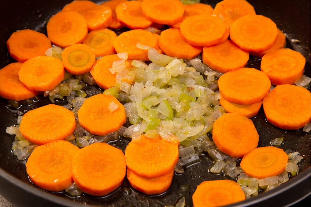Pregatire morcovi In primul rand am pus 120 ml de apa la fiert. Am taiat morcovii in rondele subtiri si ceapa cat mai fin. Am calit morcovii cu ceapa un putin ulei incins in prealabil.
