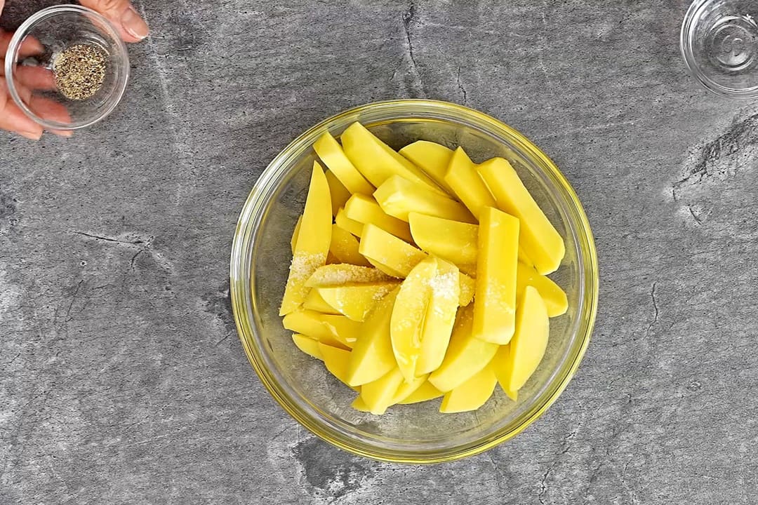 - Cartofii i-am curatat de coaja, i-am spalat bine si i-am taiat in bucati egale, pentru a se gati uniform. I-am uns cu ulei de masline, apoi i-am condimentat cu sare si piper, amestecandu-i bine astfel incat fiecare bucata sa fie acoperita uniform.