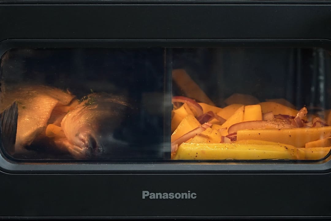 - In compartimentul special al airfryerului Panasonic Flex NF-BC1000 am adaugat apa, deoarece am ales sa gatesc initial cu abur. Acest tip de airfryer permite prepararea cu abur intr-o zona, in timp ce in cealalta poti gati alt preparat, iar tehnologia Gentle Steam ajuta la pastrarea suculentei in interior si a texturii crocante la exterior.